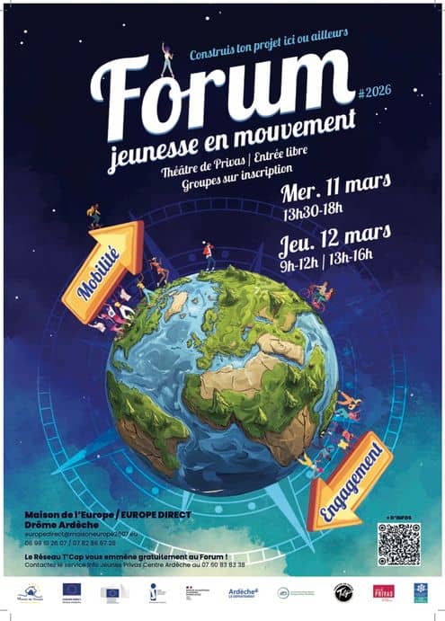 Inscription d'un groupe le jeudi 12 mars 2026Le Forum Jeunesse en Mouvement revient à Privas ! Rendez-vous les 11 et 12 mars 2026 au Théâtre de Privas, Place André Malraux 07000 Privas, pour découvrir les dispositifs qui permettent l’engagement et la mobilité internationale des jeunes ! Une trentaine de partenaires seront présents pour répondre à vos questions et vous accompagner dans la construction de vos projets de mobilité internationale et d’engagement local !