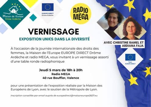 À l’occasion de la journée internationale des droits des femmes, la Maison de l’Europe EUROPE DIRECT Drôme Ardèche et radio MEGA, vous invitent à un vernissage assorti d’une table ronde radiophonique.